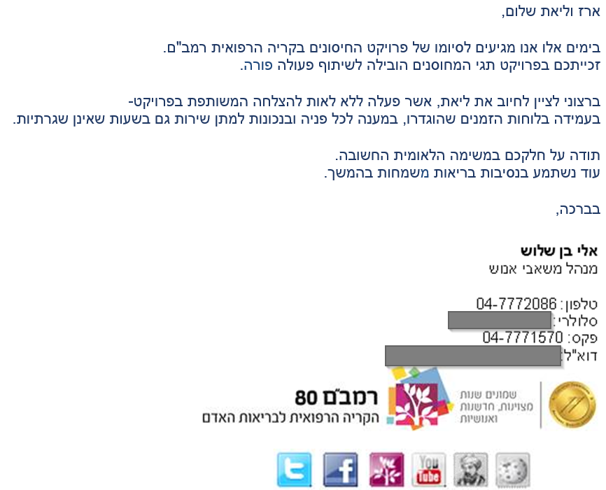 אנו מודים על שיתוף הפעולה עם הקריה הרפואית לבריאות האדם רמב”ם