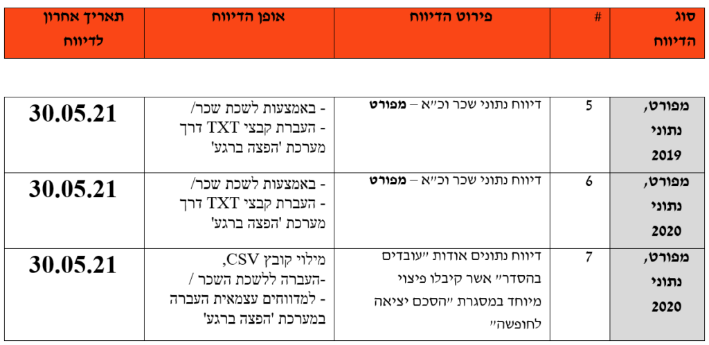 כלל העובדים ידווחו באופן פרטני במקביל להעברה שוטפת של תלושי השכר. עד היום, הדיווח התחלק לבעלי שכר גבוה ובעלי תפקידים, אשר מדווחים בצורה פרטנית, ולעובדי דירוגים, אשר מדווחים במקבץ.