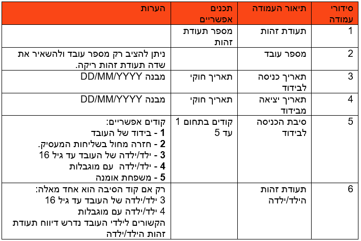 לזיהוי עובד זר חובה לדווח גם את מספר העובד (עמודה 2).