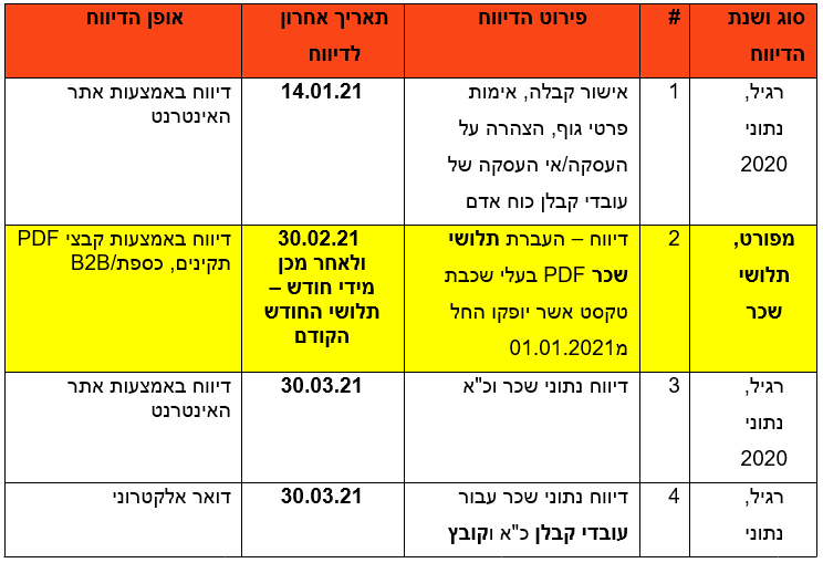 להלן לוח הזמנים השנתי והמועדים האחרונים להגשת דיווחי השכר כפי שפורסם בקובץ ההנחיות לדיווח המפורט אשר נשלח מאגף השכר בחודש ינואר 2021.
